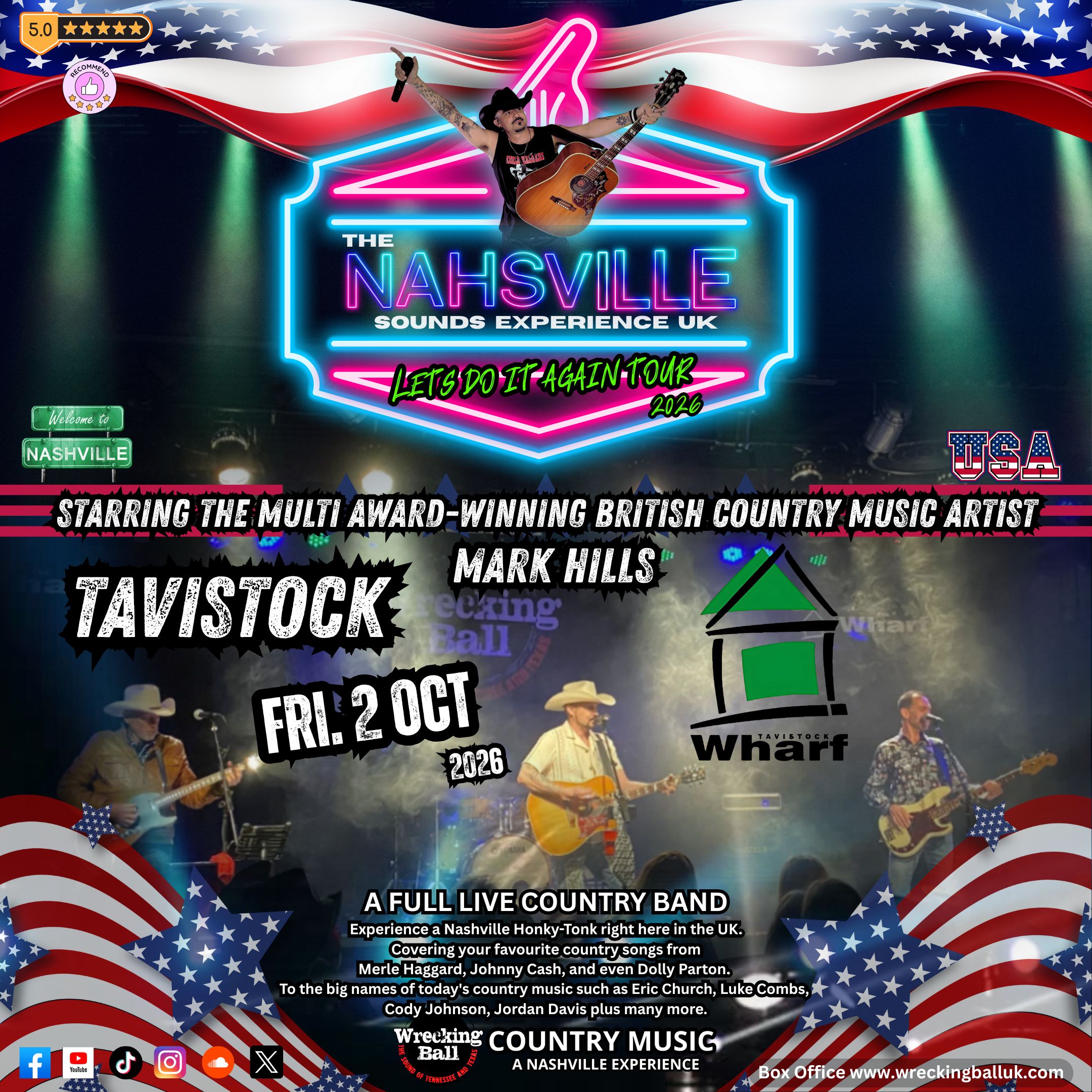 Multi award winning UK Country singer, Mark Hills, together with his band Wrecking Ball are the real deal when it comes to playing a blend of traditional, outlaw and new country music. Together, they will transport you on a journey to the home of country music - Nashville, where you will hear some of your favourite songs from Merle Haggard, Johnny Cash, Alan Jackson, Luke Combs, Eric Church, Kenny Rogers, Cody Johnson – even Dolly Parton and many, many more.