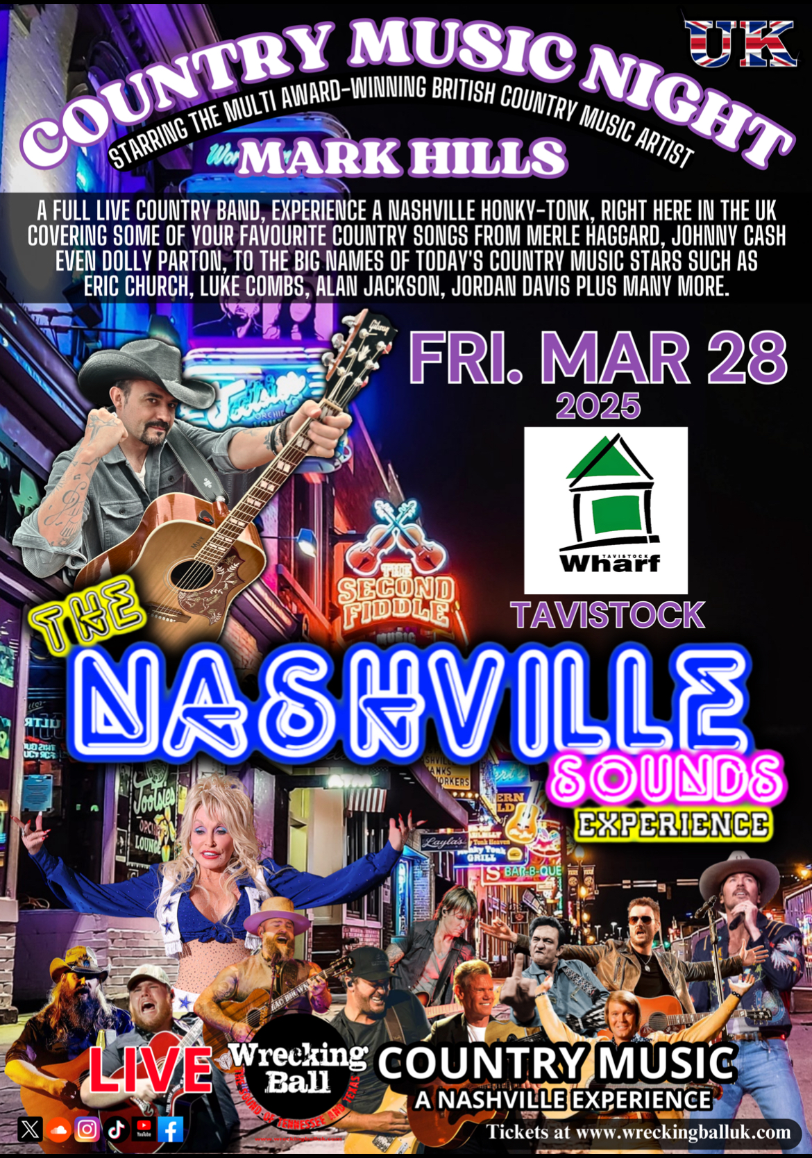 Multi award winning UK Country singer, Mark Hills, together with his band Wrecking Ball are the real deal when it comes to playing a blend of traditional, outlaw and new country music. Together, they will transport you on a journey to the home of country music - Nashville, where you will hear some of your favourite songs from Merle Haggard, Johnny Cash, Alan Jackson, Luke Combs, Eric Church, Kenny Rogers, Midland – even Dolly Parton and many, many more.